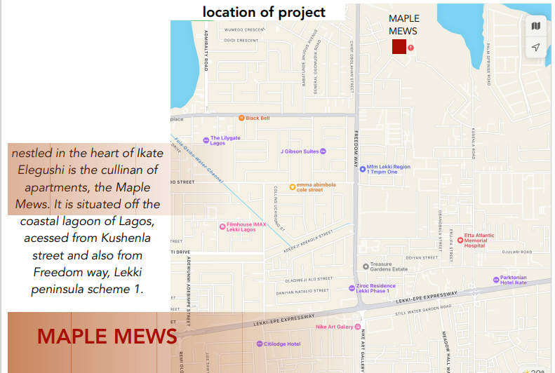 Nestled in the heart of Ikate Elegushi is the cullinan of apartments, the Maple Mews. It is situated off the coastal lagoon of Lagos, acessed from Kushenla street and also from Freedom way, Lekki peninsula scheme 1.